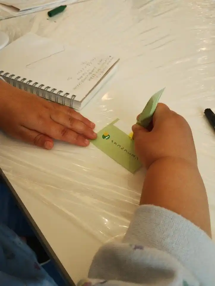 最年少参加者が、自分で作ったクレヨンの描き心地を楽しむ様子 |