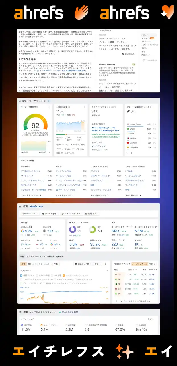 Ahrefs Pte. Ltd. (エイチレフス)は、世界トップレベルの規模を誇る独自クローラーとデータ技術により正確かつ鮮度の高いデータを収集・解析し、世界をリードする SEO 分析機能を主軸とし、AI 検索分析、AI コンテンツ作成、ウェブトラフィック分析、SNS 投稿などマーケティング機能を網羅したオールインワン・マーケティングツール「Ahrefs(エイチレフス)」を開発・提供しています。世界 180 カ国以上を超えるユーザーに利用され、競合分析からコンテンツ戦略まで、データに基づいた効果的なマーケティング戦略の立案・実行を支援しています。 |
