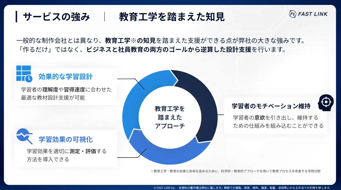 株式会社FAST LINKは、教育工学とインストラクショナルデザインに基づく設計力を強みとし、教育機関や企業向けにeラーニング構築支援事業を展開しています。 |