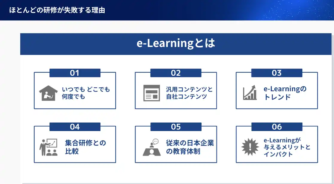 ラーニングは、適切に設計されていれば本来、学習効果が非常に高く、「いつでも、どこでも、何度でも」学べる優れた教育手法です。 |