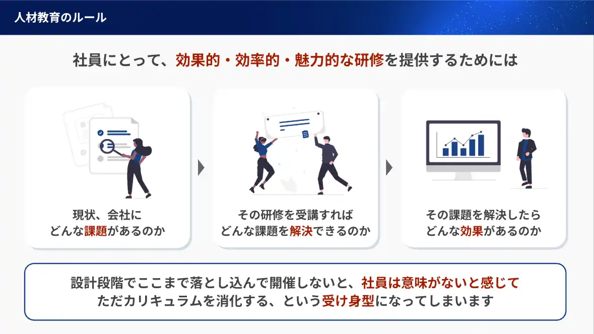 しかしその一方で、受講生の学習意欲が上がらない、教育が業績向上につながらないといった課題も多く見られます。 |