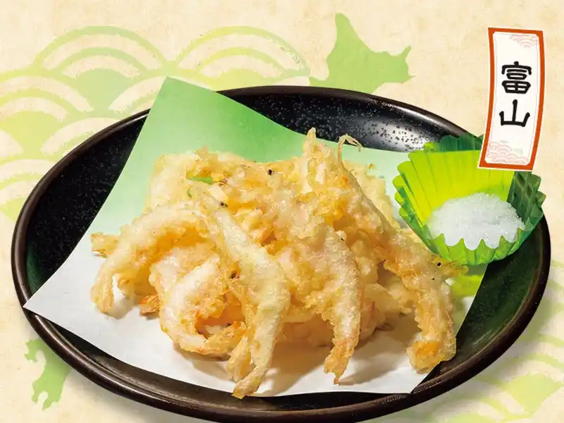 【富山】白海老: 「富山湾の宝石」白海老をサクッとした衣で包みました。ふんわり優しい白海老の甘みをお楽しみください。750円 (税込825円) |