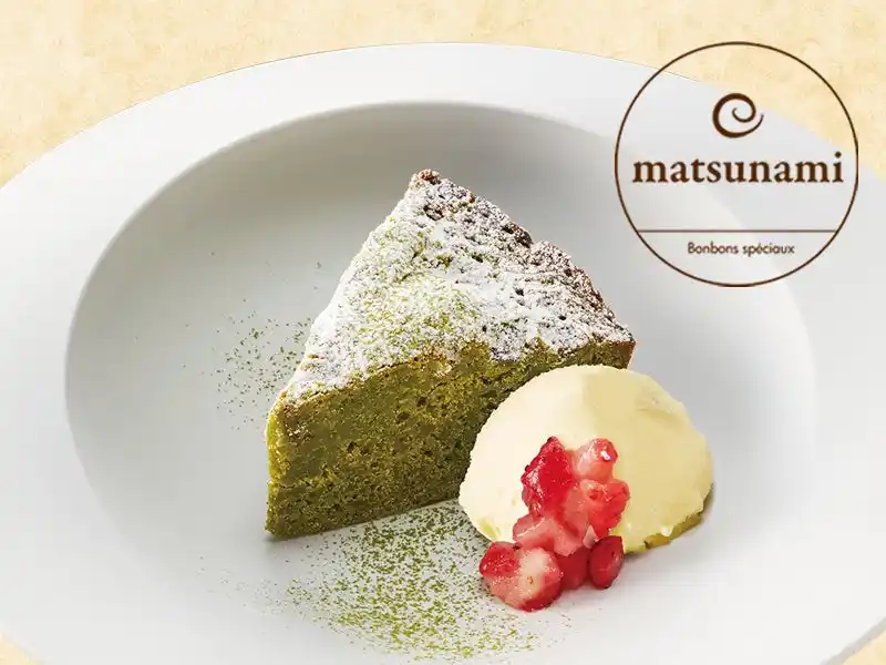 緑茶のガトーショコラバニラアイス添え:ホワイトチョコの生地に銚子丸の粉末緑茶を混ぜ込んだガトーショコラです。ミルクのコクとお茶の爽やかな渋味をお楽しみください。450円 (税込495円) |