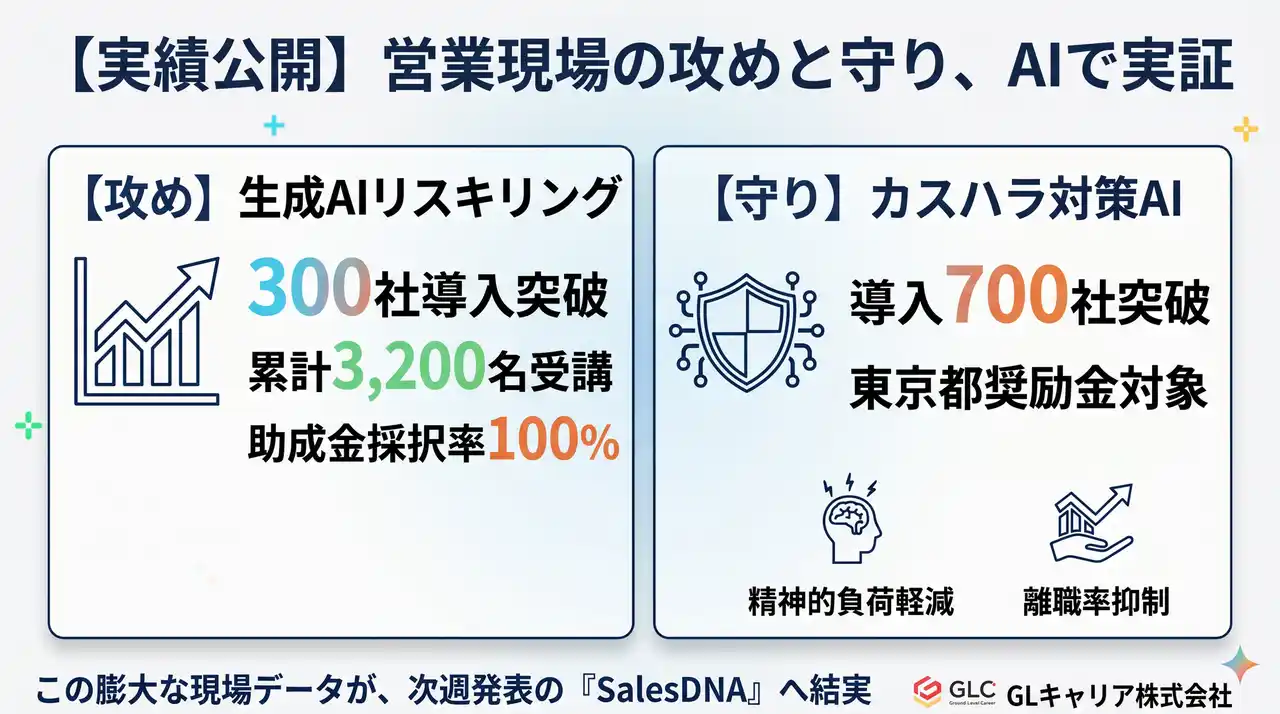 DXコンサルティングおよび人材教育事業を展開するGLキャリア株式会社(本社:東京都港区、代表取締役:小川和紘)は、本日、完全独立した経営体制のもと、当社の事業の柱である「生成AIリスキリング」および「カスタマーハラスメント(カスハラ)防止対策ロープレAI」における最新の導入実績を公開いたします。 |