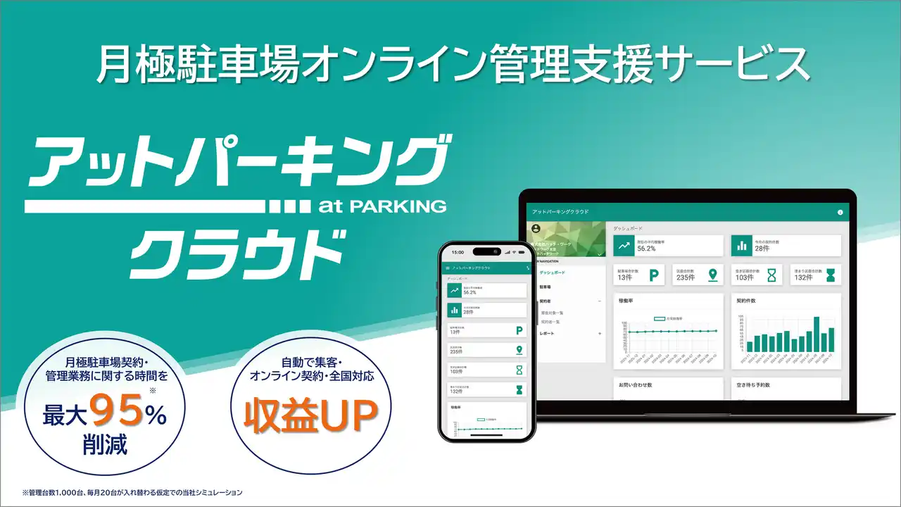 「アットパーキングクラウド」は、月極駐車場の契約手続き、空き管理、顧客管理、請求業務などをオンラインで一元管理できるサービスです。集客支援、オンライン契約、収納代行・滞納保証、空き待ち予約、利用者対応窓口などの機能を備え、業務の効率化と安定運用を支援します。あわせて、管理・運営に精通したスタッフが運用面にも伴走し、現場に即した形で継続的な価値提供を行っています。 |