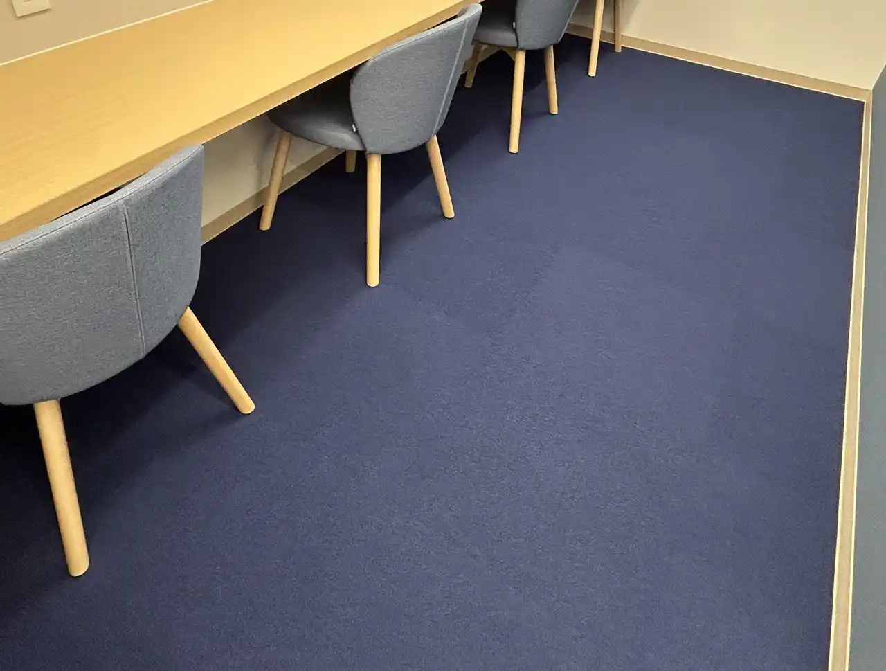 ・当営業所の床材には、川島織物セルコン製のタイルカーペットを採用しています。同社は環境大臣より「エコ・ファースト企業」に認定されており、廃床材を再資源化するリサイクル循環システム「e-RECYCLED」を展開しています。この仕組みにより、使用済みタイルカーペットを無駄なく活用し、新たな再生素材のタイルカーペットとして生まれ変わらせることで、産業廃棄物の削減に貢献しています。今回の導入では、約135kgのリサイクル原料を活用することで、CO2排出量を約73%削減する効果が見込まれており、環境負荷の低減に寄与しています。 |