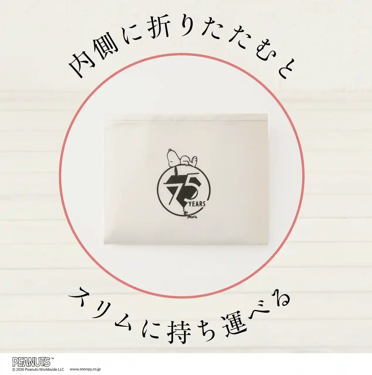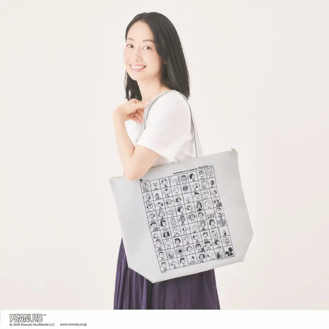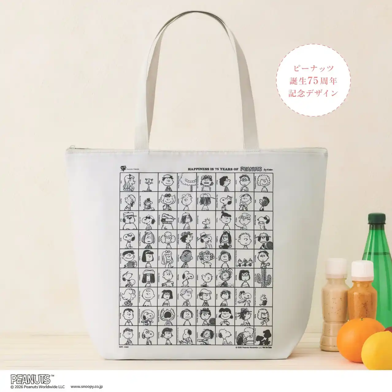| ピーナッツ誕生75周年記念のアートがデザインされた、スヌーピーの保冷バッグが雑誌付録として初登場! ピーナッツ誕生75周年を記念し、ピーナッツの75メンバーが大集合した、オールスターデザインのキュートな保冷バッグ。生地色はどんな装いにも合わせやすい淡いパールグレーで、A3サイズも余裕で入る大きさ。耐荷重も10kgあり、マチも十分あるため2Lのペットボトルなら5本入ります。スマートフォンなどを収納できる内ポケットも、75周年記念のロゴ入り。保冷バッグを内側にコンパクトに折りたたむと、内ポケットへ本体をスリムに収納でき、とても手軽に持ち運べます。ファスナーもついて、持ち手もラクに肩掛けできる長さとなっており、使いやすさを追求した仕様です。この夏のお買い物に大活躍すること間違いなしです。 | ||||||||||||||