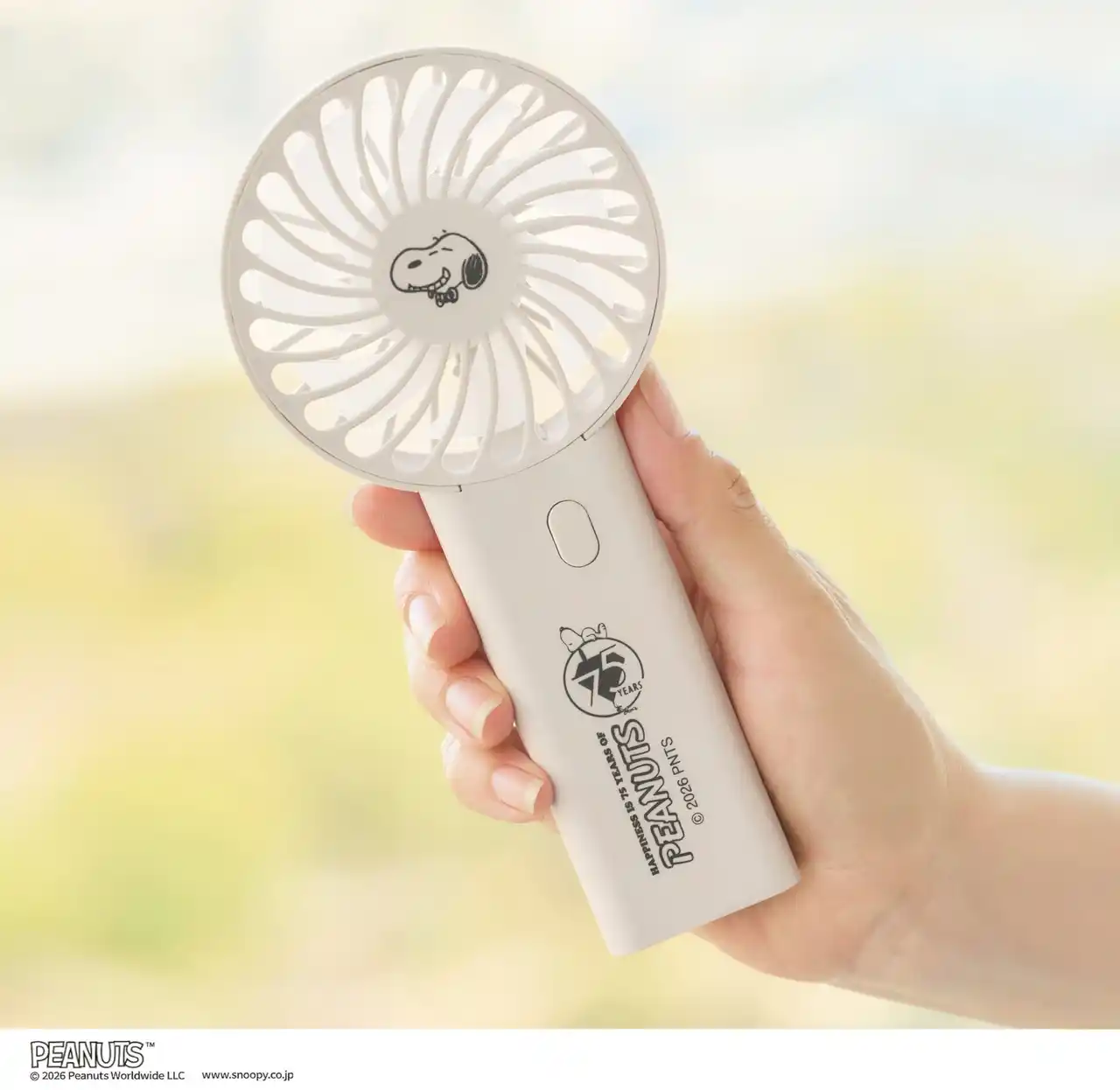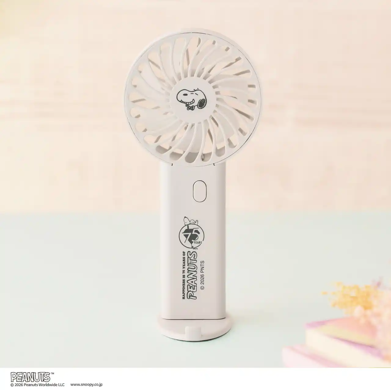 | ピーナッツ誕生75周年記念のアートがデザインされた、スヌーピーのハンディ扇風機が雑誌付録として初登場! スヌーピーの表情がとってもキュートなハンディ扇風機。持ち手には75周年記念のロゴがプリントされています。コンパクトなサイズで持ち運びしやすく、手持ちはもちろん、付属のスタンドに立てれば卓上でも使えます。さらにスタンドのフチにスマートフォンを載せて、動画などを手ぶらで楽しむことができます。USB充電ケーブルもついており、ワンタッチでスイッチONするだけで、3段階の風量調節が可能。誰でも簡単に使用できます。 | ||||||||||||||
