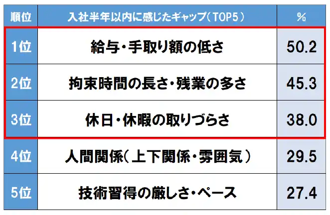 また、新卒入社半年以内に感じたギャップとしては、「給与」(50.2%)、「労働時間」(45.3%)、「休日・休暇」(38.0%)が上位に挙がりました。 |