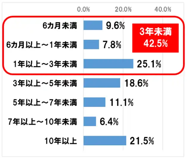 美容師の初職における就業期間を見ると、「6カ月未満」が9.6%、「6カ月以上~1年未満」が7.8%と、1年未満での離職が2割弱に上ります。さらに、「1年以上~3年未満」を含めると、3年未満での離職は42.5%と4割を超えています。 |