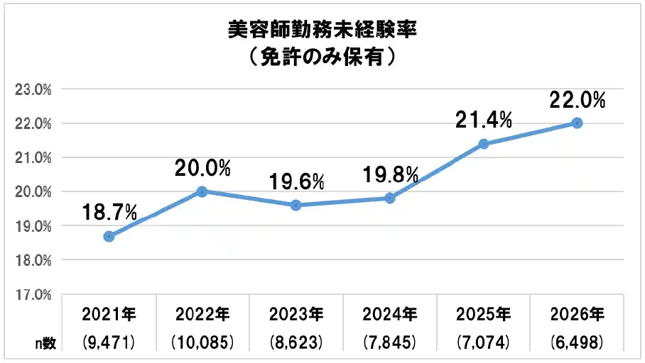 美容師免許を保有しているが、一度も美容師として勤務経験がない人の割合は、3年連続で上昇し、2026年にはここ6年で最も高い22.0%に。 |