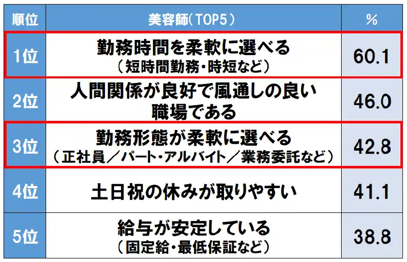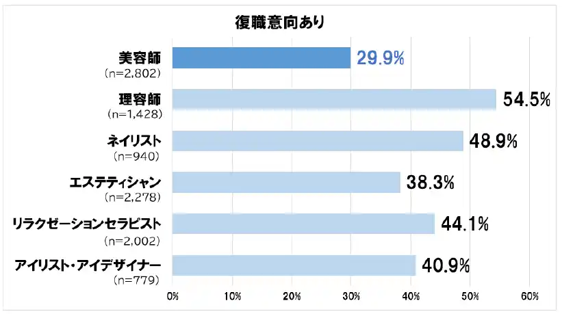 美容師は他の美容職と比べて復職意向が低く、働き方や就業条件、技術面での不安などが影響し、復職にあたってのハードルが相対的に高い職種である可能性があります。 |