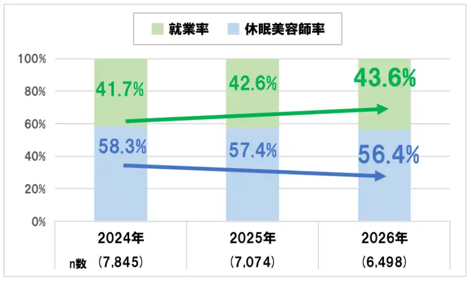 美容師の就業率は41.7%(2024年)→42.6%(2025年)→43.6%(2026年)と上昇しました。一方で、休眠美容師率は58.3%→57.4%→56.4%と低下しているものの、依然として半数以上が美容師として就業していない状態です。 |