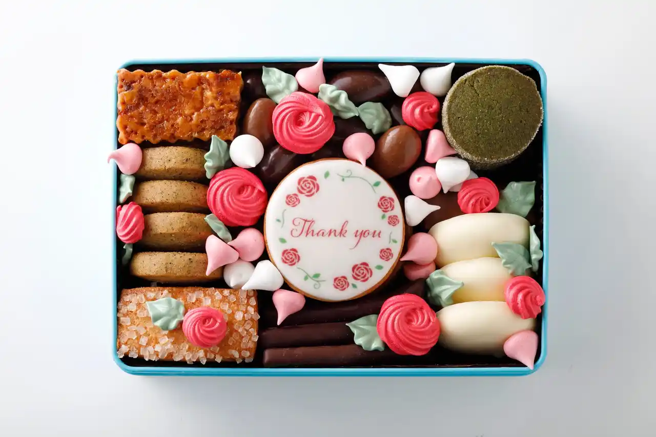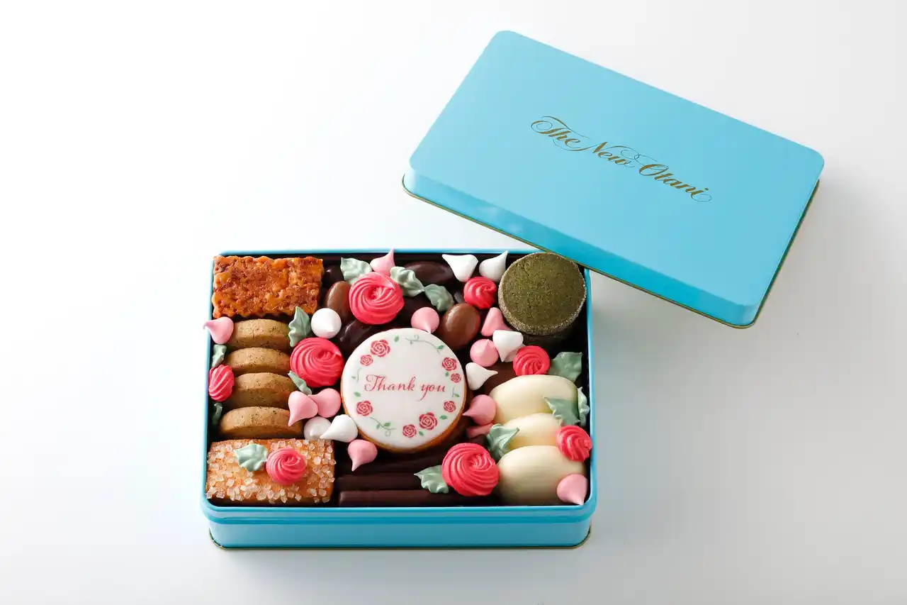 抹茶やアールグレイ、バニラを使用したティータイムにぴったりなクッキーや、ワインとも相性が良い、パルメザンチーズで作られたクッキーはじめ9種類のクッキーと、5種類の濃厚なチョコレート、ローズメレンゲを忍ばせた華やかなクッキー缶『SATSUKIチョコレート&クッキー ~母の日~』が期間限定で登場。缶の蓋を開けると色とりどりの焼き菓子と繊細なローズメレンゲに気分が高まります。中央には、日頃の“ありがとう”という気持ちを綴ったメッセージクッキーをあしらい、見た目も華やかに。「幸せを呼ぶ色」を連想させる“オータニブルー”の缶は、スイーツを食べた後も大切なものを入れておける、いつまでも手元に残しておきたいパッケージに仕上げました。 |