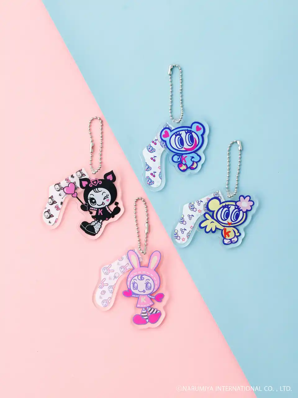Tabio公式オンラインストアおよび取り扱い店舗でコラボレーション商品1点以上を含む税込2,750円以上お買い上げのお客様に、先着で数量限定の「オリジナルアクリルキーホルダー」をノベルティとしてプレゼントいたします。 ※ノベルティがなくなり次第、キャンペーンは終了となります。あらかじめご了承ください。ノベルティは全4種類あり、ナカムラくん・ハナちゃん・ベリエちゃん・デビリーちゃんとそれぞれの総柄ソックスのミニチュアがセットになったアクリルキーホルダーです。キャラクターはランダムでの配布となります。 |