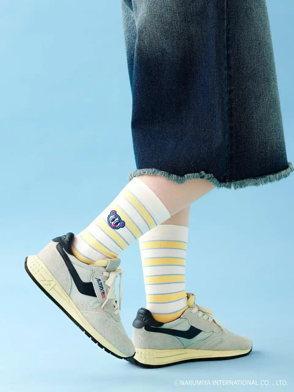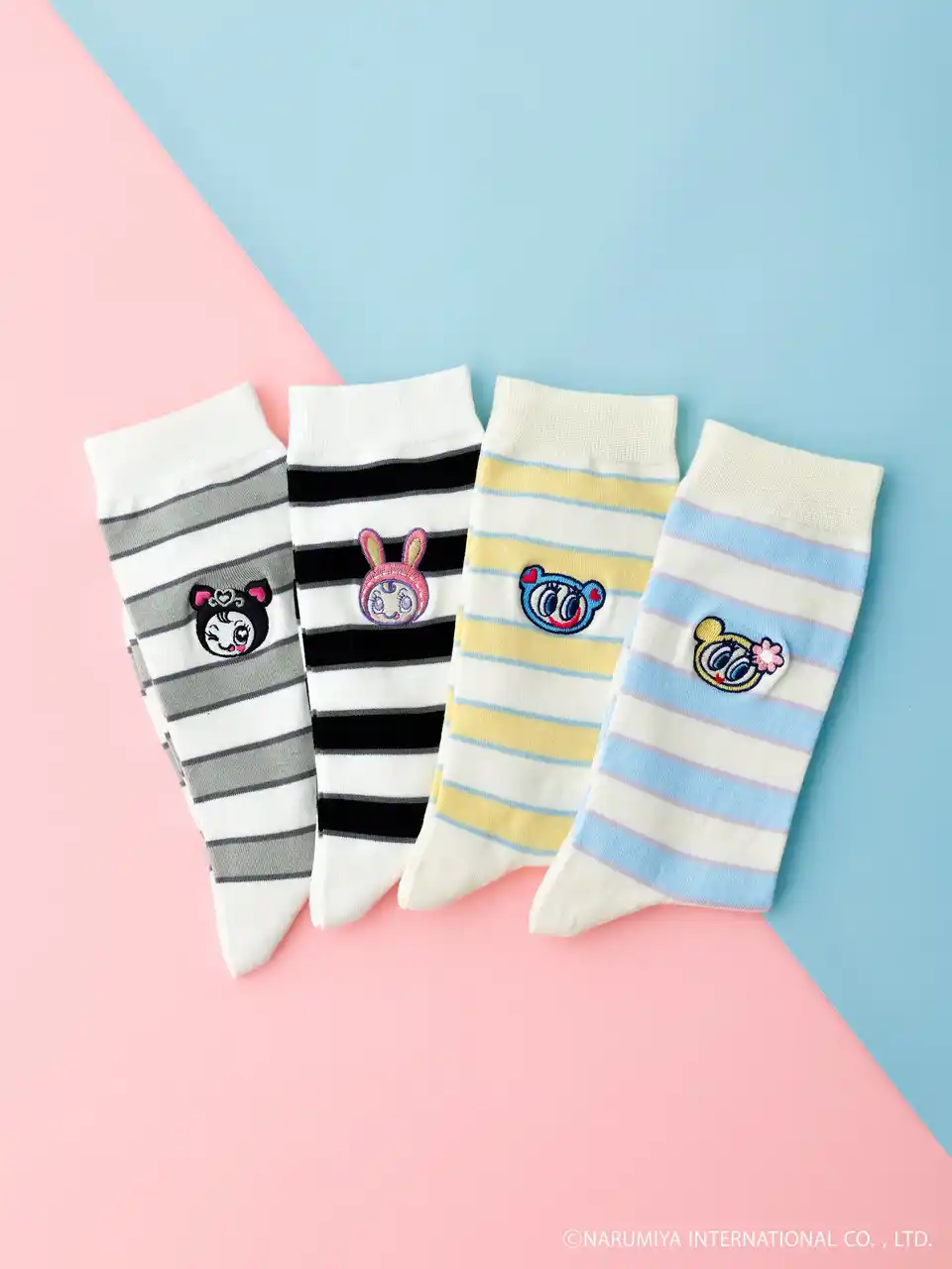 商品は、いずれもふくらはぎにかかるくらいのクルー丈です。ボーダーを基調とした「ボーダー刺繍スリークォーター」とキャラクターの顔の柄を商品全体にあしらった「総柄クルー」の2型、それぞれ4柄、合計8品番で展開します。サイズは22.5cm~24.5cmの1サイズです。 |