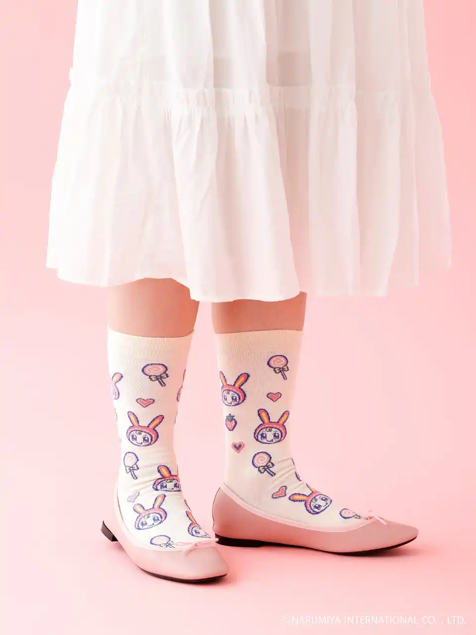 キャラクターそれぞれのお顔の柄を基調とし、そこに可愛らしいモチーフをちりばめた、最高にハッピーな気持ちになれる一足です。サクランボやスターやハートの小さなモチーフがブランドの世界観を演出します。 |