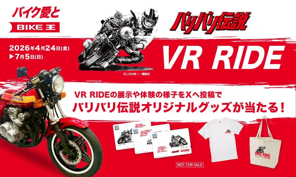 「常識を壊し、新たな価値と感動を生む」を企業理念に掲げ、「バイクライフの生涯パートナー」を目指す株式会社バイク王&カンパニー(代表取締役CEO:澤 篤史、本社:東京都世田谷区、証券コード:3377、以下「当社」)は、2026年4月24日(金)から7月5日(日)まで、静岡県函南町の「バイカーズパラダイス南箱根」にて、人気漫画「バリバリ伝説」を再現したCB750Fの実車と、最新のVRシミュレーターを融合した体験型展示「バリバリ伝説 VR RIDE」を実施します。 |