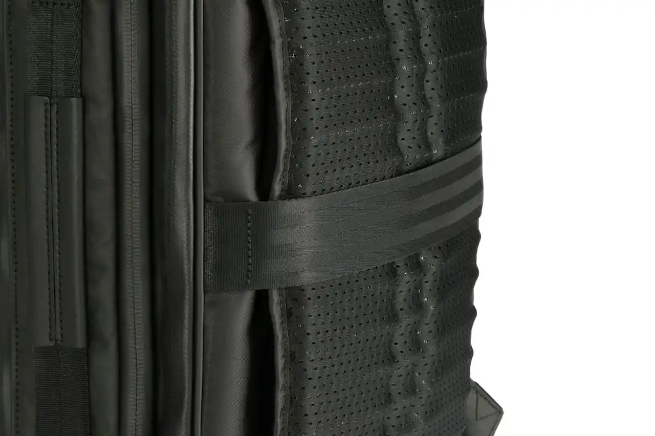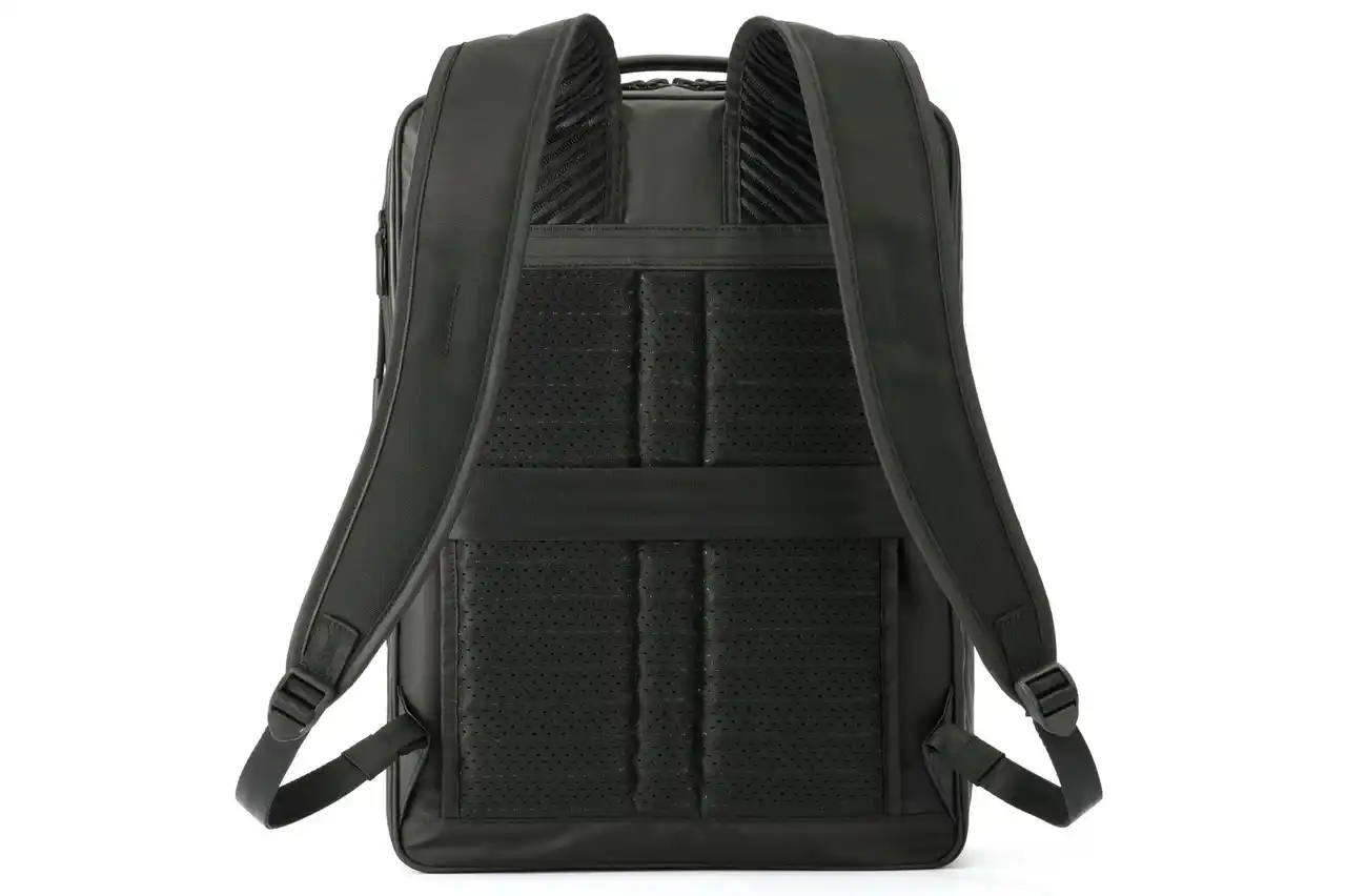 背面には通気性に優れた3D織物「AQフロント」を、ショルダーストラップにはメッシュ素材を用い、熱や湿気を逃がしやすい設計にしました。 |