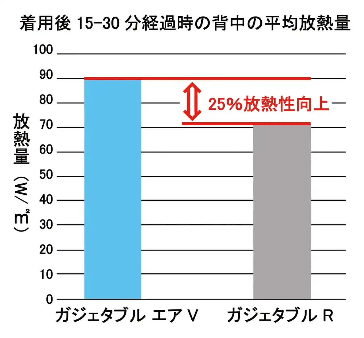 熱や湿気を逃がしやすく、従来モデル「ガジェタブル R」と比べて、着用後15~30分経過時の背中の平均放熱量が25%向上しました。 |