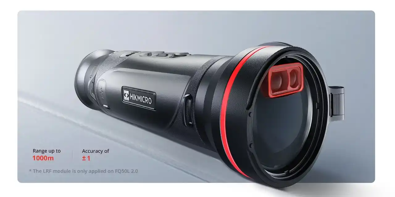 FQ50Lでは、シンプルな円筒形デザインを損なうことなく、レンズユニット内にレーザーレンジファインダーモジュールを組み込みました。最大1,000m先までの距離を正確に測定でき、さらに水平距離の表示も可能です。 |