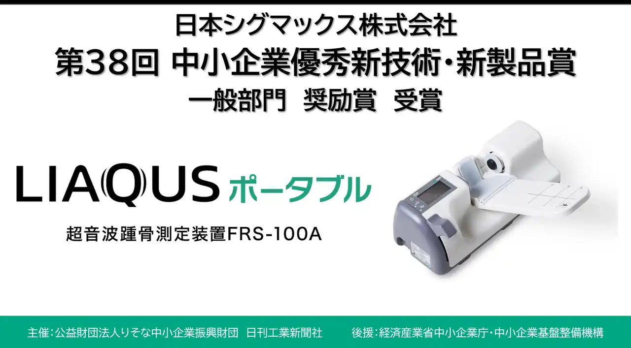 日本シグマックス株式会社(本社:東京都新宿区、代表取締役社長:鈴木 洋輔)は、公益財団法人りそな中小企業振興財団(以下、りそな中小企業振興財団)と日刊工業新聞社が主催する「第38回中小企業優秀新技術・新製品賞」にて、小型・軽量で場所を選ばず使用可能な「超音波踵骨測定装置FRS-100A『LIAQUS(リアクス)ポータブル』(以下、LIAQUSポータブル)」が一般部門・奨励賞を受賞いたしました。 |