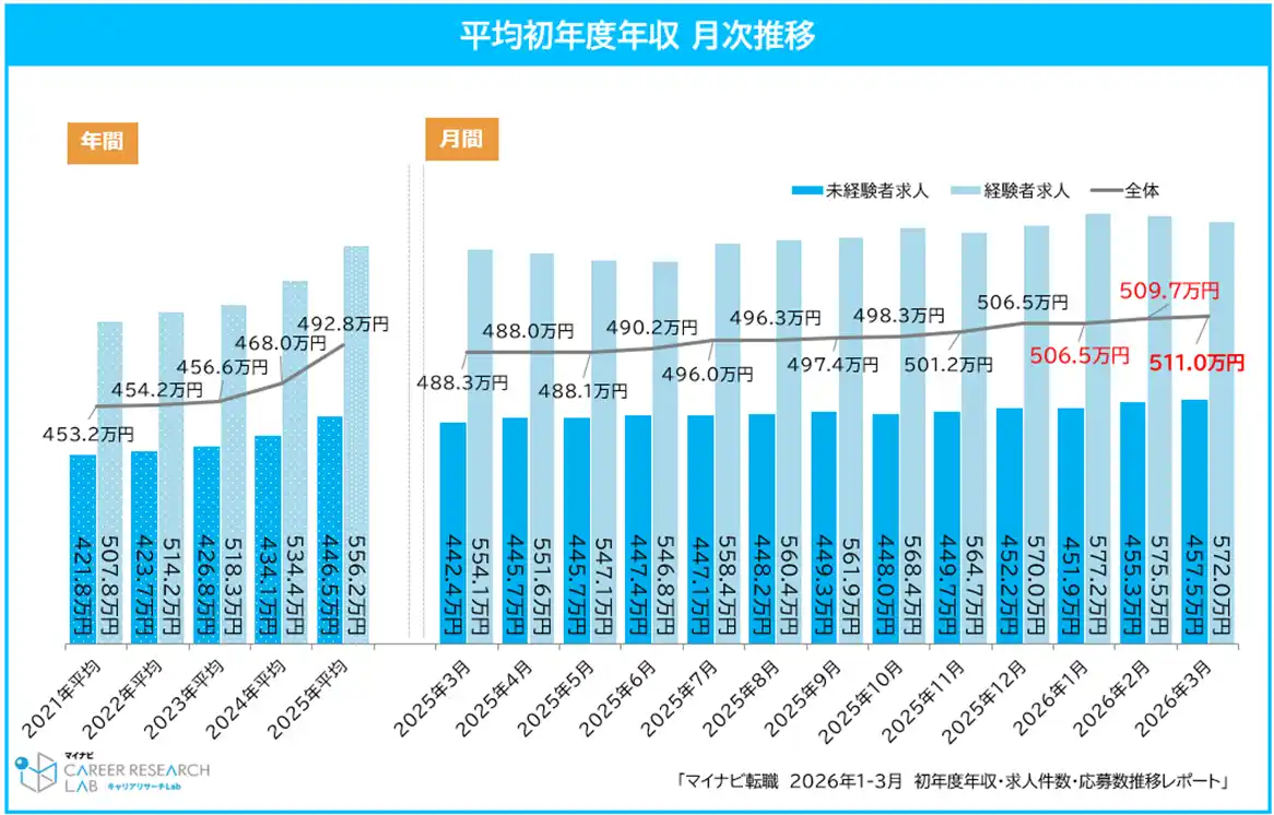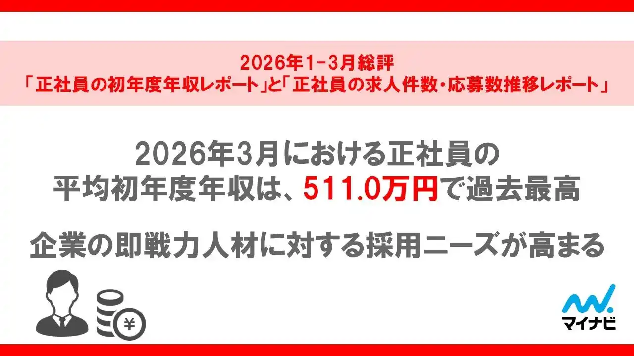 ◆2026年3月の正社員平均初年度年収は、511.0万円で過去最高 |