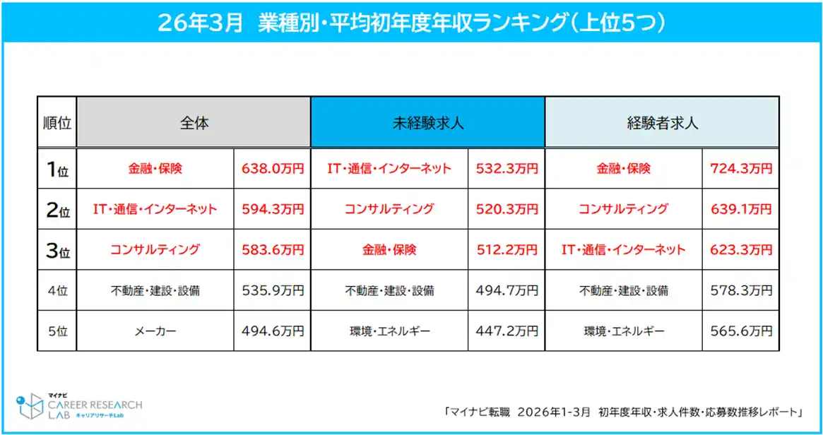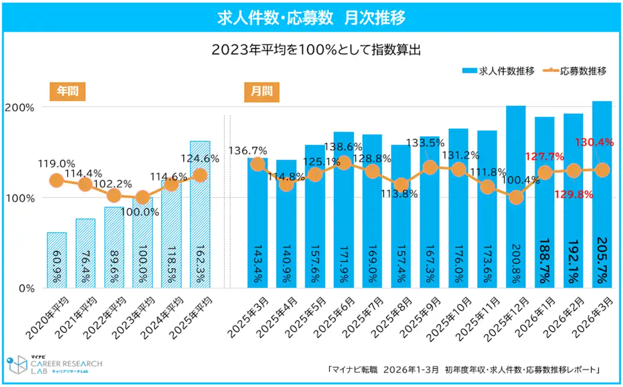 株式会社マイナビ(本社:東京都千代田区、代表取締役 社長執行役員:粟井俊介)が運営する総合転職情報サイト『マイナビ転職』(https://tenshoku.mynavi.jp/)は、「正社員の平均初年度年収推移レポート」と「正社員求人件数・応募数推移レポート」について、2026年1-3月の総評を発表しました。本調査は、総合転職情報サイト『マイナビ転職』に掲載された求人の「平均初年度年収※1(未経験※2・経験者※3求人別)」、「求人件数・応募数」の推移を調査したものです。 |