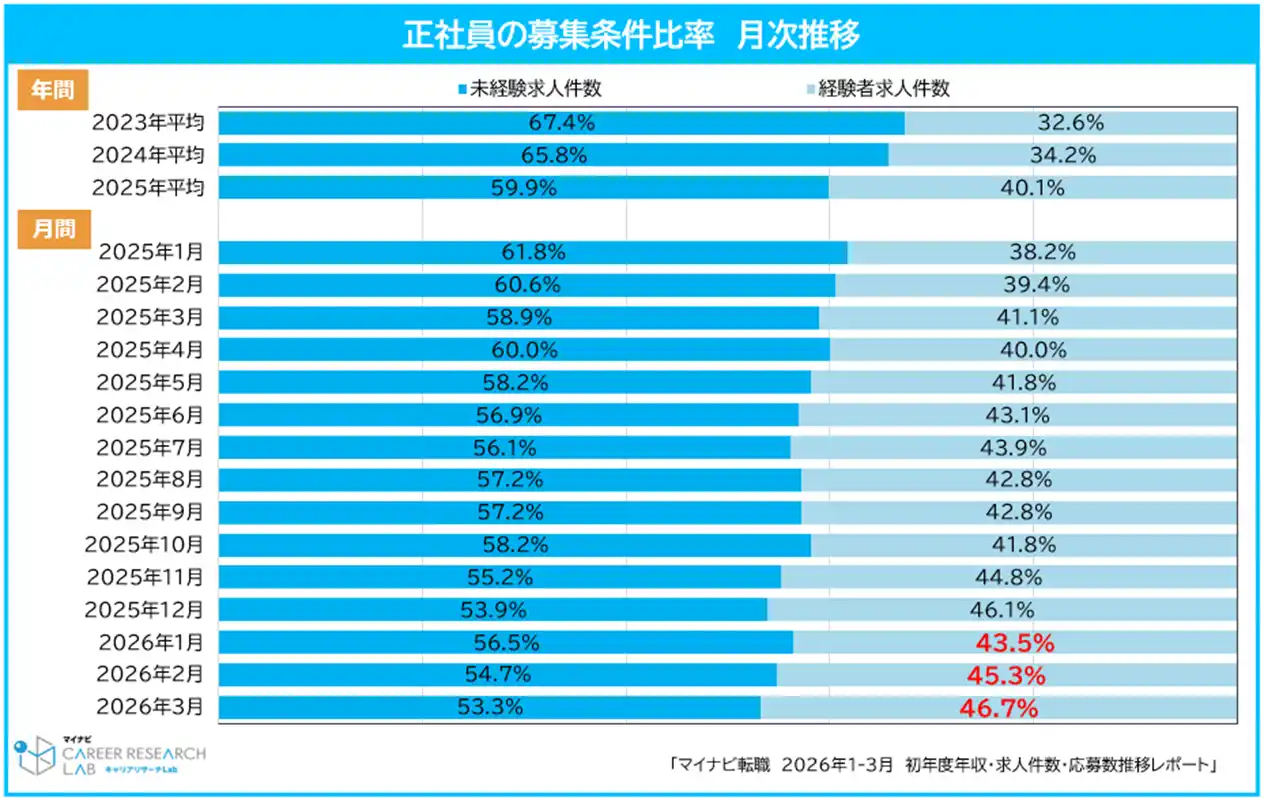 経験者向け求人比率は、2026年3月が46.7%で最高値に。企業の即戦力人材に対する採用ニーズが高まっている