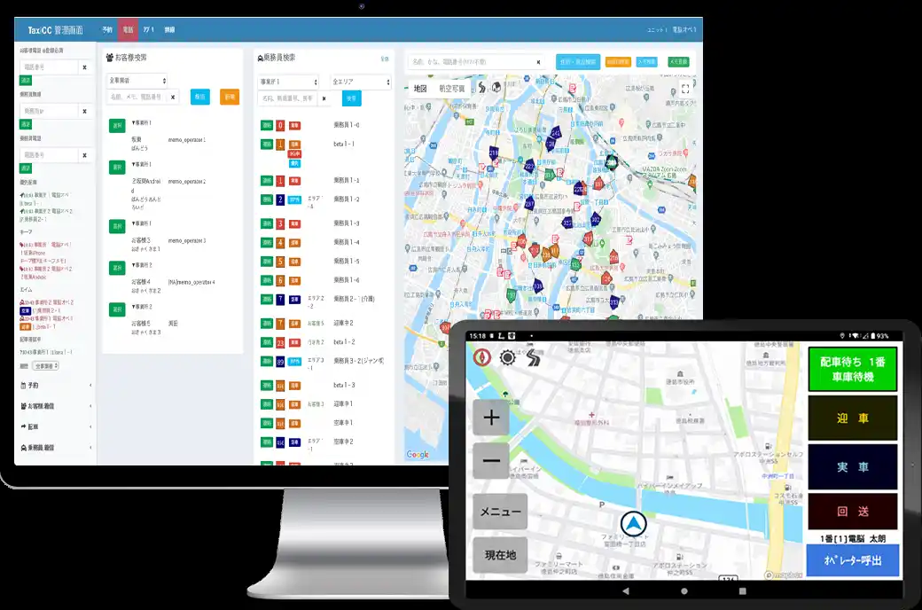 クラウド型タクシー配車システム「DS」は、配車オペレーター用画面とドライバー用車載タブレットをセットにした配車システムで、タクシー事業者の業務効率化を実現します。現在、全国47都道府県で約650社・約2万3000台のタクシー車両に導入されています。 |