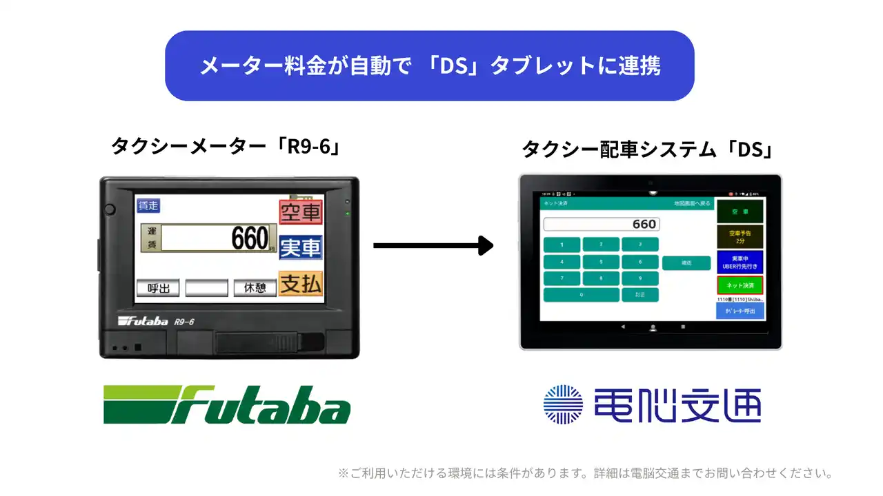株式会社電脳交通(本社:徳島県徳島市、代表取締役社長:近藤 洋祐、以下「電脳交通」)は、二葉計器株式会社(本社:大阪府大阪市、代表取締役社長:土井 邦夫、以下「二葉計器」)のタクシーメーター「R9-6」と、電脳交通のクラウド型タクシー配車システム「DS」の料金連動を開始したことをお知らせします。
