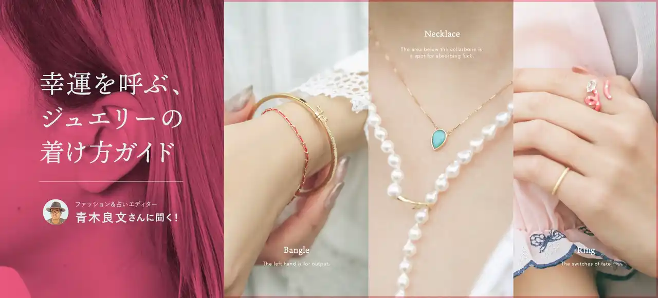 アッシュ・ペー・フランス株式会社(本社:東京都港区、代表取締役:富高健一郎)は、2026年4月24日(金)より、ファッション&占いエディター 青木良文氏との企画第2弾として、「幸運を呼ぶ、ジュエリーの着け方ガイド」を公開いたします。2026年は“水”の気が満ちる一年。第1弾で提案した「LUCKYジュエリー」に続き、本企画では“自愛”をテーマに、ジュエリーをどのように身に着けるかにフォーカス。ポジション別のラッキールールをもとに、日常に取り入れやすいジュエリーの楽しみ方をご紹介します。あわせて、青木氏のアドバイスによるラッキージュエリーを集積したジュエリーフェアを、全国の対象店舗にて開催いたします。 |