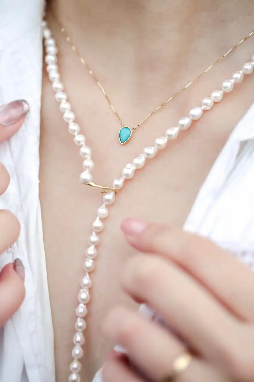 【運気を吸収するスポットは鎖骨下3~5cm】オパールネックレス ¥177,100 / :ATELIER VM パールネックレス ¥132,000 / PREEK |