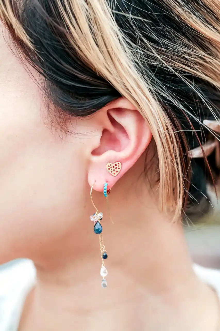 【揺れは“ご縁”、留めは“吸収”】ハートピアス ¥132,000 / LIA DI GREGORIO ターコイズフープピアス ¥94,600 / We by WHITEbIRD フックピアス ¥152,900 / Sweet Pea |