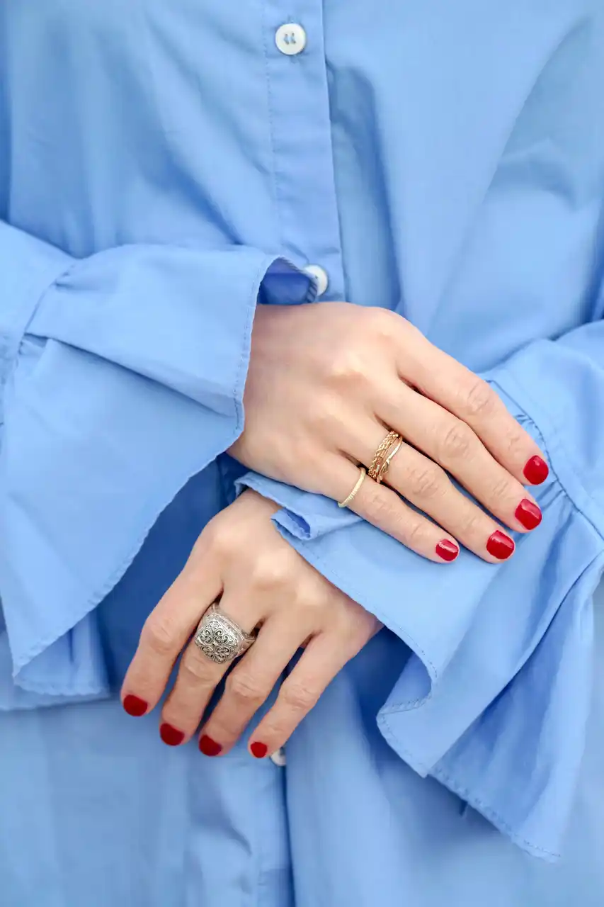 (右手 薬指)リング 上から ¥88,000、¥96,800、¥73,700 / ATELIER VM (右手 小指)ゴールドリング ¥67,100 / Carolina Bucci (左手)シルバーリング ¥¥36,300 / GEROCHRISTO |