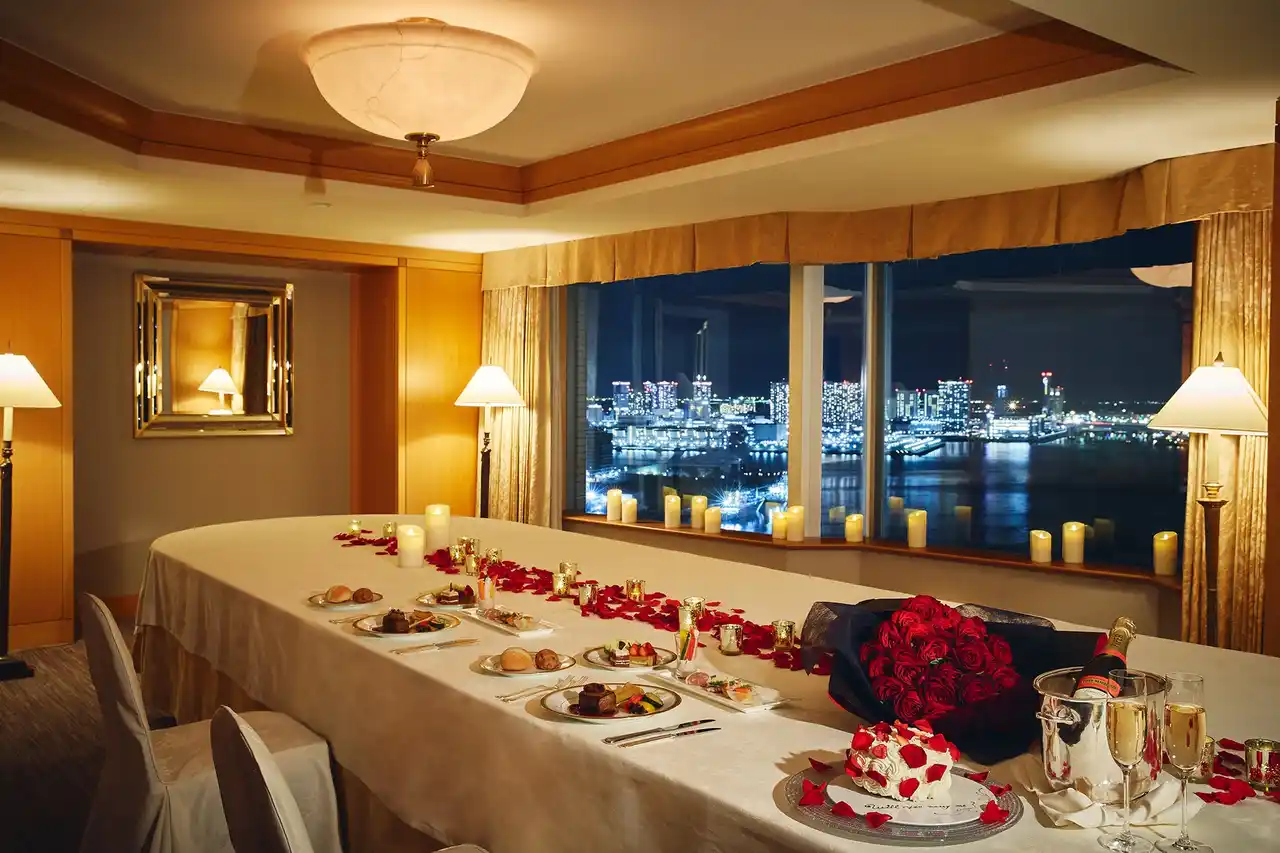 23階の高層階から、美しい夜景が窓一面に広がる贅沢な個室を貸し切り、周りを気にせずご自身のペースでお食事をお楽しみいただけます。お食事後、デザートのリクエストでスペシャルメッセージを入れたケーキと花束をお届けし、サプライズプロポーズをしていただきます。 |