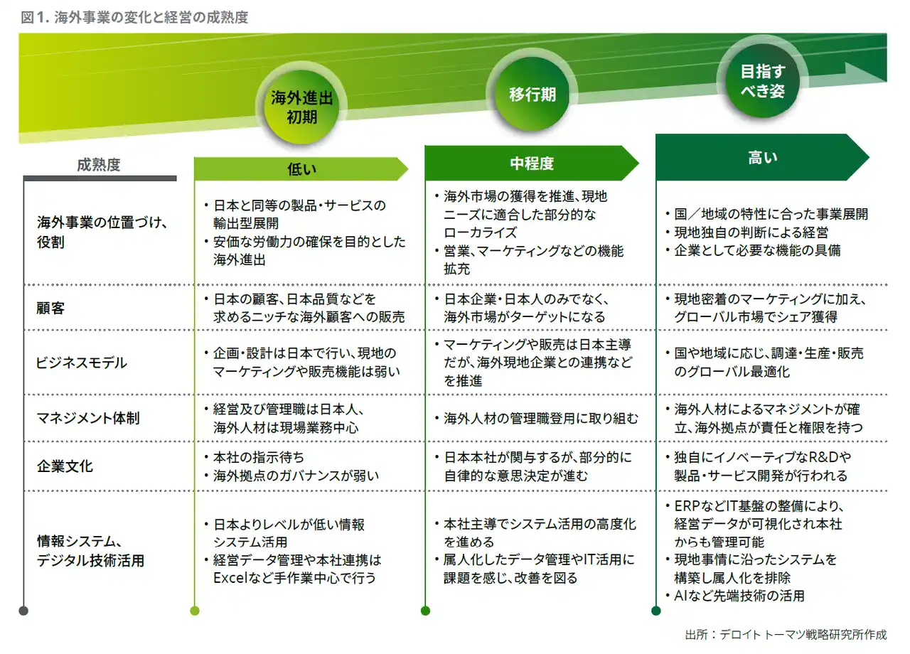 本調査では、海外事業の発展段階を『海外進出初期』から『目指すべき姿』まで3段階の成熟度モデル(図1)で定義し、日系企業の現状を分析しました。その結果、多くの企業で主要な海外拠点の海外人材(非日本人)管理職比率や一部権限の譲渡など制度面の現地化は進んでいるものの、意思決定のあり方やIT活用の高度化といった運用面の『質』において、目指すべき姿との大きな乖離があることが浮き彫りとなりました。具体的には、1.ローカライズの「質」の壁(経営の現地化)、2.AI・IT人材不足、3.脱アナログ基盤の遅れ、という以下の3つの課題が挙げられます。 |