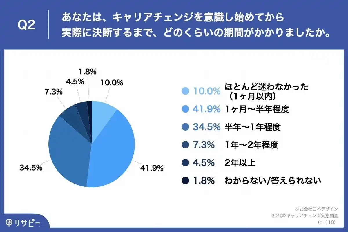 「Q2. あなたは、キャリアチェンジを意識し始めてから実際に決断するまで、どのくらいの期間がかかりましたか。」(n=110)と質問したところ、「1ヶ月~半年程度」が41.9%、「半年~1年程度」が34.5%という回答となりました。 |