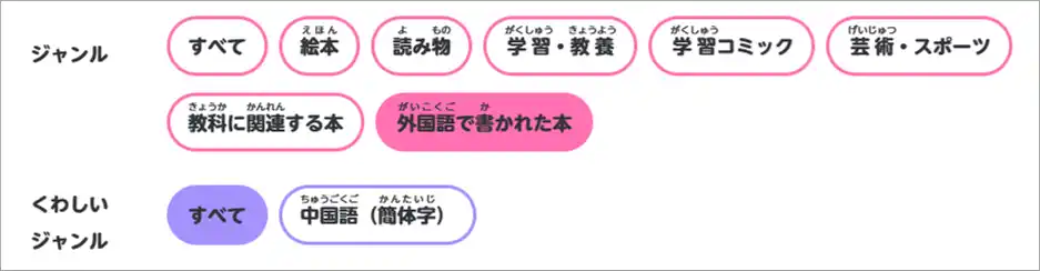 「くわしくさがす」>「ジャンル」にて、「外国語で書かれた本」を選択することで、該当タイトルを一覧で確認することが可能です。 |