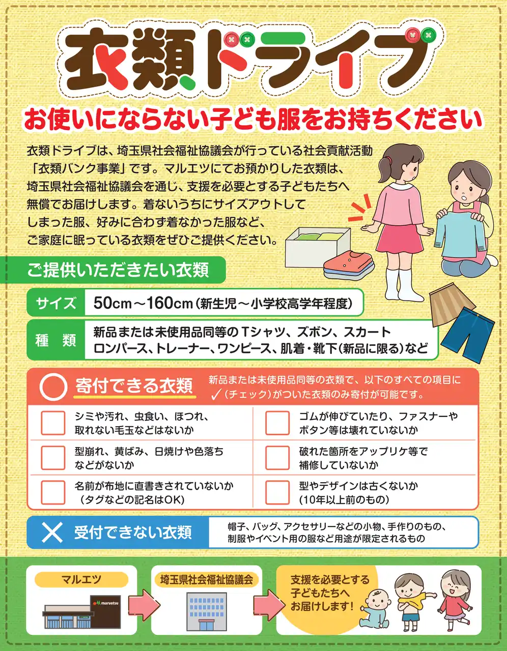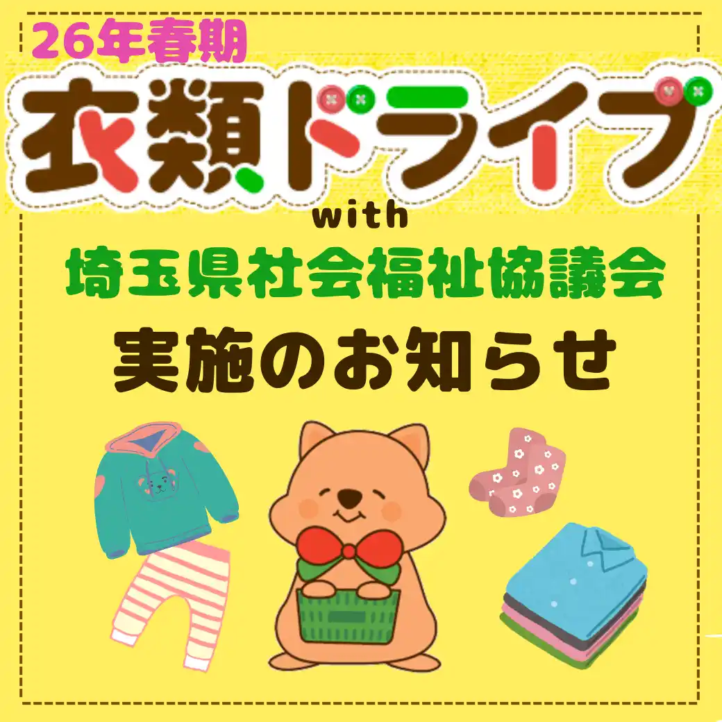 を通じて衣料品を届ける「衣類ドライブ」を、4月25日(土)から期間限定で、埼玉県内の5店舗にて実施します。 |