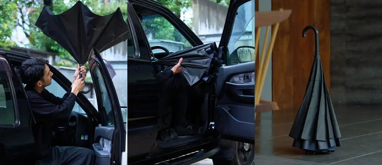 撥水性の高い生地であっても、使用を重ねる中で汚れや手の油分が付着し、撥水性能は徐々に低下していきます。その結果買い替えられてしまうケースが少なくありません。こうした課題に対し、「SAKASANANO」では撥水面に手が触れにくい逆さ構造を採用。撥水性能の持続性向上を図りました。傘を閉じた際に濡れた面が内側になるため、手や⾐服を濡らさず、車の乗り降りや電車内での使用時にも快適に使用できます。ご自身も、そして周りの人も濡らさない配慮にもつながります。さらに、自立構造により傘立てが不要といった、逆さ傘の従来の機能性も備えています。 |