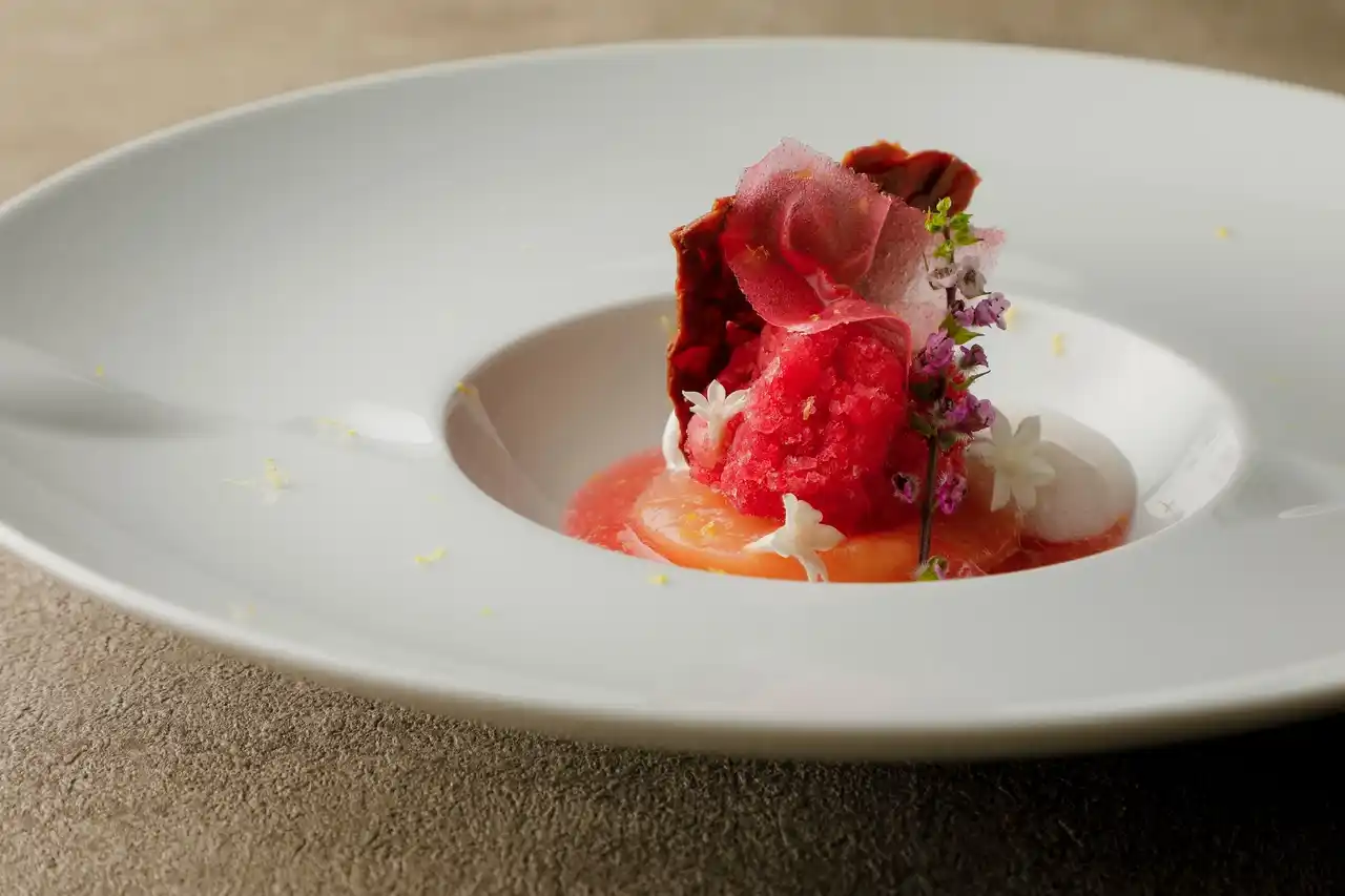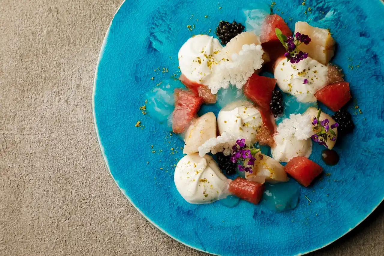 「帆立貝 燻製 ピンクグレープフルーツ」は、グリルした帆立貝をマリネし、ピンクグレープフルーツやレモングラスのゼリー、フィンガーライム、燻製したフロマージュブランを添えたやわらかな酸味と柑橘の香りを味わう一品。海のさざ波を表現したタピオカチップの食感がアクセントになります。 |