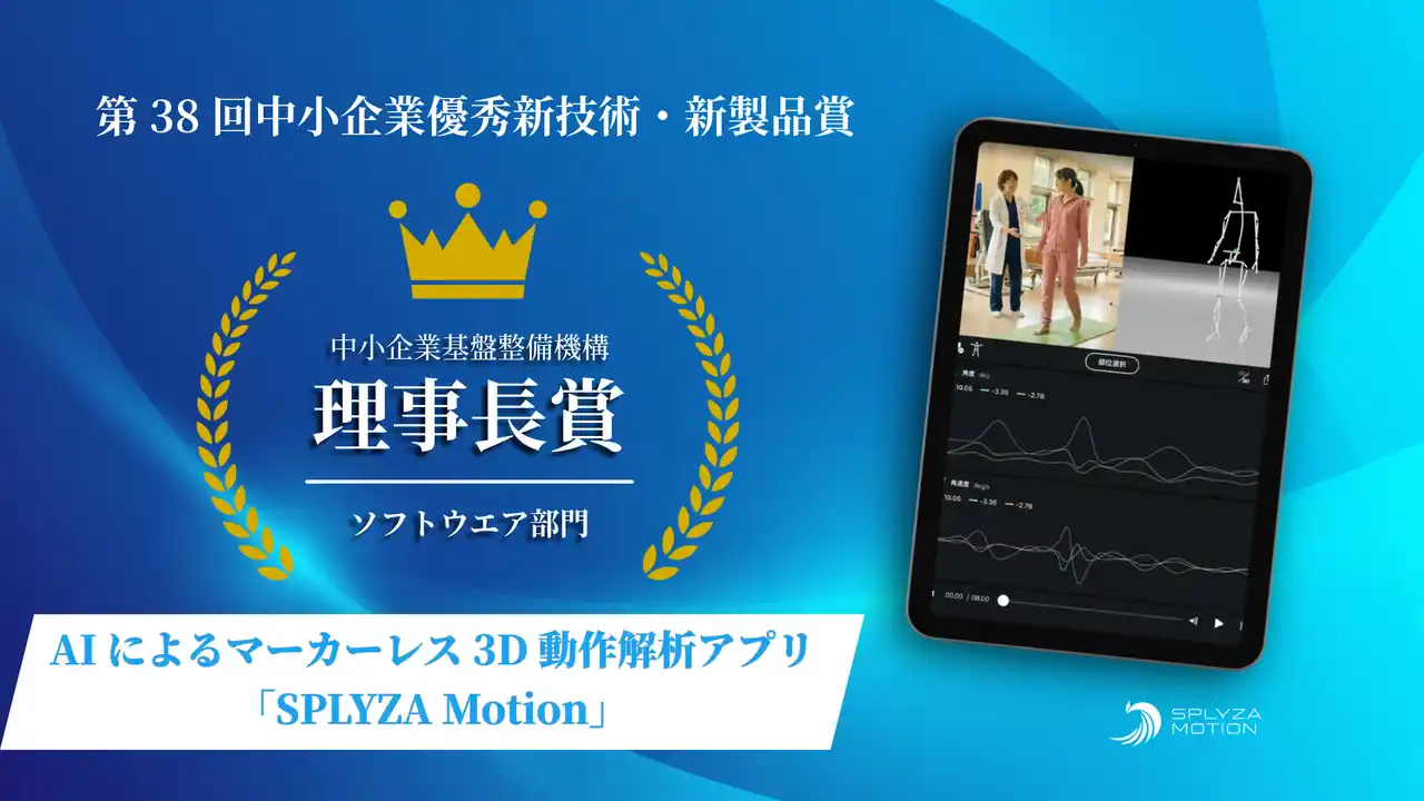 アプリケーション開発で「スポーツ教育とヘルスケア」の支援を行う株式会社SPLYZA(所在地:静岡県浜松市、代表取締役:土井 寛之、以下「SPLYZA」)が開発・提供するAIによる3D動作解析アプリ「SPLYZA Motion」が、2026年4月23日発表「第38回中小企業優秀新技術・新製品賞」のソフトウェア部門において、「中小企業基盤整備機構理事長賞」を受賞したことをお知らせいたします。