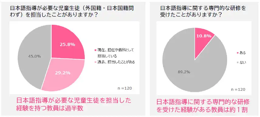 本調査は、全国の教員および教育委員会・管理職208名を対象に実施しました。日本語指導が必要な児童生徒を担当した経験を持つ教員は過半数にのぼる一方で、専門的な研修を受けた経験がある教員は約1割にとどまり、十分な知識や支援体制が整わないまま対応を担っている実態が浮き彫りとなりました。 |