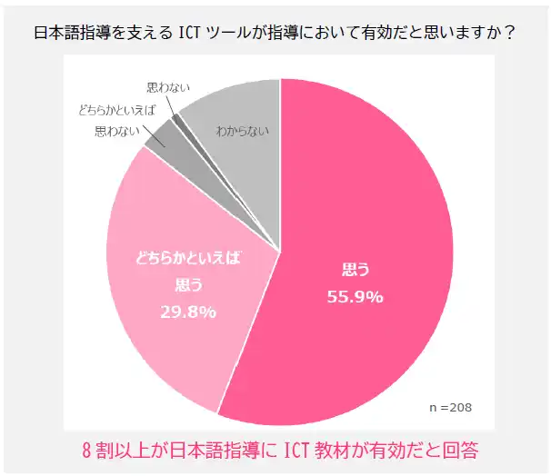 さらに、日本語指導においてICT教材が有効と考える回答は、全体で8割を超えました。なかでも教育委員会・管理職に限ると9割を超えており、現場だけでなく行政側においても導入の必要性が強く認識されていることが明らかになりました。 |