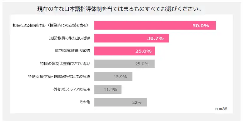 今回の調査では、教育委員会・管理職の56.1%が「日本語指導が必要な児童生徒が増加・急増している」と回答している一方で、主な対応は「担任による授業内での個別対応」(50.0%)に依存しており、依然として教員のマンパワーに頼った運用が続いています。増加するニーズに対して、従来の体制のままでは持続的な対応が難しくなりつつあります。 |