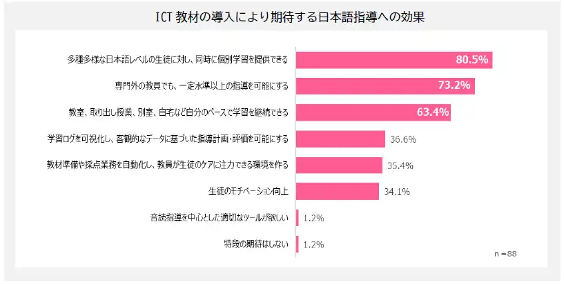 ICTには、母国語で意味を確認しながら学べる機能や、AIによる理解度に応じた個別最適な学習、場所を問わず継続できる学習環境の提供などが期待されており、従来の一斉指導では対応が難しい課題を補完する手段として、その重要性が高まっています。 |