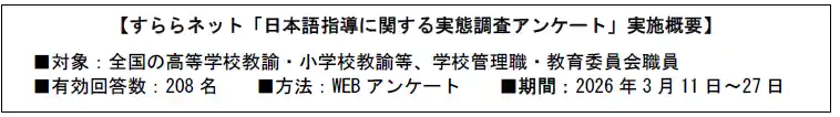 AIを活用したアダプティブな対話式 ICT 教材の開発と提供を行う株式会社すららネット(本社:東京都千代田区、代表取締役:湯野川孝彦)は、国内の教育現場における日本語指導の実態に関する調査を実施しました。その結果、日本語指導の多くが担任教員に委ねられている一方で、専門的な研修機会が十分に確保されていない実態が明らかになりました。こうした状況を背景に、ICT教材の活用を必要とする声が全体の8割以上にのぼり、日本語指導におけるICTの重要性が強く認識されていることが分かりました。 |