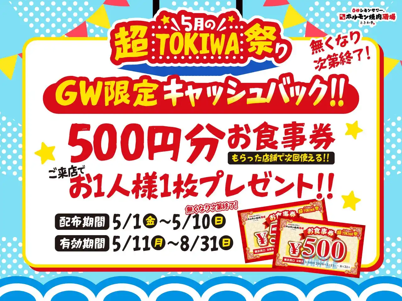 | GOSSO株式会社(本社:東京都渋谷区、代表取締役:藤田建)は、全国の「0秒レモンサワー(R) 仙台ホルモン焼肉酒場 ときわ亭」で、『5月の超TOKIWA祭り』と題してお得なキャンペーンを期間限定で開催します。5月1日(金)~5月10日(日)の期間中来店いただいた方に500円分のお食事券をプレゼントする『GW限定キャッシュバック!!』イベントを実施します。さらに、5月11日(月)~5月31日(日)の期間中、対象商品をお値段そのままで1.5倍量で提供する『GW明けも楽しもうぜ!! 1.5倍サイズUP』イベントを開催します。https://store.zero-tokiwa.com/ | |||