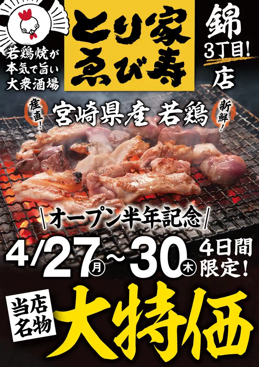 宮崎産の旨い若鶏焼きが人気の大衆酒場『とり家ゑび寿(とりやえびす)』錦店(運営:株式会社大庄)は、名古屋屈指の飲食店激戦区・錦三丁目でのオープンから、おかげ様で半年を迎えることができました。これを記念して、2026年4月27日(月)から4月30日(木)までの4日間限定で「名物 大特価イベント」を開催します。日頃の感謝を込め、人気の「特大もも焼き」(通常980円→780円)、「せせり焼き」(通常580円→420円)、「つくね焼き」(通常680円→500円)をはじめ、「ゑび寿 チキンナゲット」(通常550円→380円)、「玉子焼き」(通常480円→350円)、「鶏白湯(ぱいたん)ラーメン」(通常750円→550円)の全6品を赤字覚悟の特別価格で提供します。さらに、期間中は「ブラックニッカハイボール」(通常450円)と「梅風味サワー」(通常350円)が何杯飲んでも1杯199円です。この絶好の機会を見逃すな!!